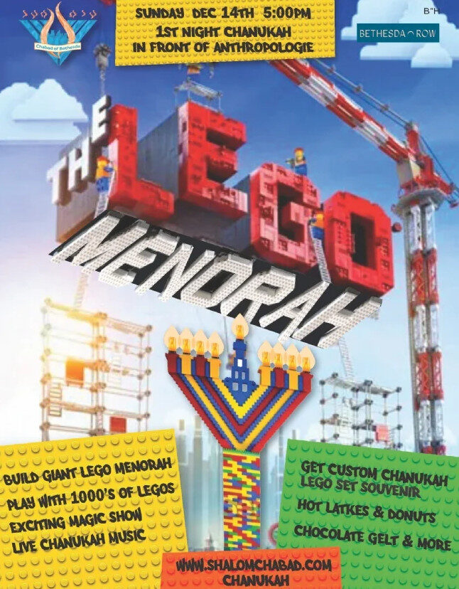 Join us Sunday, December 21st for the LEGO Menorah Lighting at Bethesda Row! Build the giant LEGO menorah, play with thousands of LEGOs, enjoy an exciting magic show and live Chanukah music, and even get a custom Chanukah LEGO set souvenir! Learn More.